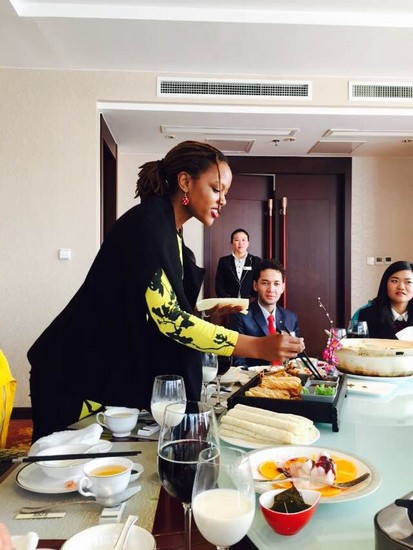 تبين الصورة ان Sharon Maingi ـ " طالبة XCMG تحت التجربة " تستخدم عيدانى الطعام لاول مرة فى حياتها لتتذوق الاكلات المفضلة الفريدة من نوعها لمدينة شيويتشو