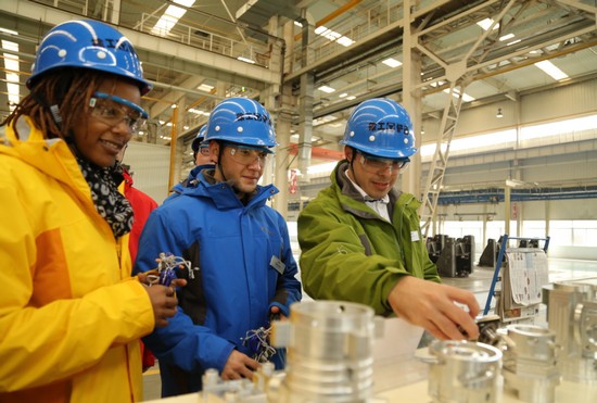 تبين الصورة ان " طلبة XCMG تحت التجربة " يزوروا بكل شغف القاعدة الانتاجية الاضخم من نوعها للودرات ذات الحمولة الضخمة