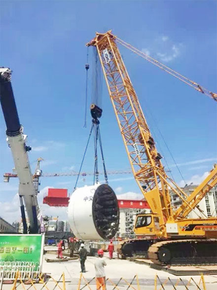 في موقع المشروع من خط مترو 2 فوتشو، يشغل واحد بيج ماك عملا مشغولا بطريقة منظمة. وآلة حفر الأنفاق بطريقة درع لرفع الطين والماء (تشير إلى ملء الطين والماء في الحجرة المغلقة علي سطح الحفر من الدرع، من خلال ضغط الطين والماء لتوازن الضغط الخارجي، من أجل ضمان استقرار وجه التربة للحفر) يصل أقصى وزن الحمولة الأمامية للدرع الي t160، وفقا لمتطلبات برنامج الرفع من أن يكون أقل من معدل التحميل ٪80، وفي السوق توجد منتجات حمولة t300 ولكن غير قادرة على تلبية المتطلبات، ويستخدم مرفاع مجنزر من 400t XCMG باستخدام الدفع الرباعي، وحزمة كاملة من نظام الطفرة الرئيسية والمساعدة بالنقل المتكامل، وتسطر علي وقت التفكيك في حالة الدرع في غضون 4 ساعات، والتحولات مريحة، وتكاليف التشغيل منخفضة، وهو أفضل خيار في الدرع والرفع.