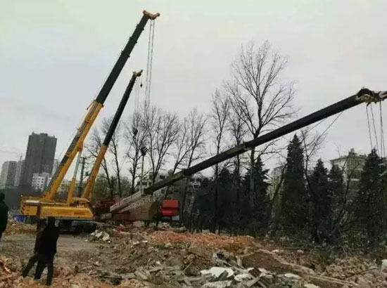 في موقع بناء في مدينة ناننينغ، حدثت حادثة تقلب رافعة على مستوى 25 طنا إلى الجانب خلال عمل البناء، ويرجع سببها إلى ظروف البناء السيئة حولها ولم تُضع الركائز بشكل ثابت. ومن حسن الحظ أن رافعتان مجنزرتان ذات ذراع التمديد والتراجع بطراز XGC55T لمجموعة XCMG قريبتان من موقع البناء، وتعاونت هتان الرافعتان لرفع الذراع الرئيسي وتعليق الخطاف، وسندتا الرافعة بسلالة، وبدأتا عملهما في عمل البناء المتوتر. وبعد ذلك، أعرب مسؤول المشروع، "بفضل الرافعة المجنزرة ذات ذراع التمديد والتراجع لمجموعة XCMG، لم نضيع وقت الإنقاذ وتكلفة الإنقاذ بسبب البيئة السيئة للبناء".