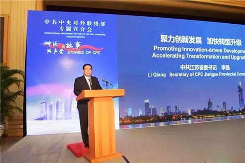 في 31 أغسطس، عقدت ادارة العلاقات الخارجية باللجنة المركزية للحزب الشيوعى الصينى الدعاية بموضوع "قصة الحزب الشيوعي الصيني: ممارسة لجنة الحزب بمقاطعة جيانغسو --- والدفع والابتكار والتحول والتنمية" في بكين، ودعت لجنة الحزب الشيوعى الصينى بمقاطعة جيانغسو لتقديم تنفيذ الأوضاع الخاصة بمقاطعة جيانغسو للأفكار الجديدة والاستراتيجيات الجديدة لحكم الدولة من قبل الأمين العام شي جين بينغ، إلي المسؤولين السياسيين الأجانب الزائرين في الصين، وكبير الدبلوماسيين بالسفارة فى الصين، وغرفة التجارة الخارجية، وممثلي الشركات متعددة الجنسيات فى الصين؛ ويظهر أن تتمتع لجنة مقاطعة جيانغسو بروح تنفيذ التعليمات الهامة الصادرة عن الأمين العام شي جين بينغ، والنتائج البارزة و الخبرات والممارسات في عملية اجراءات الابتكار الحية لتعزيز التحويل والتنمية .