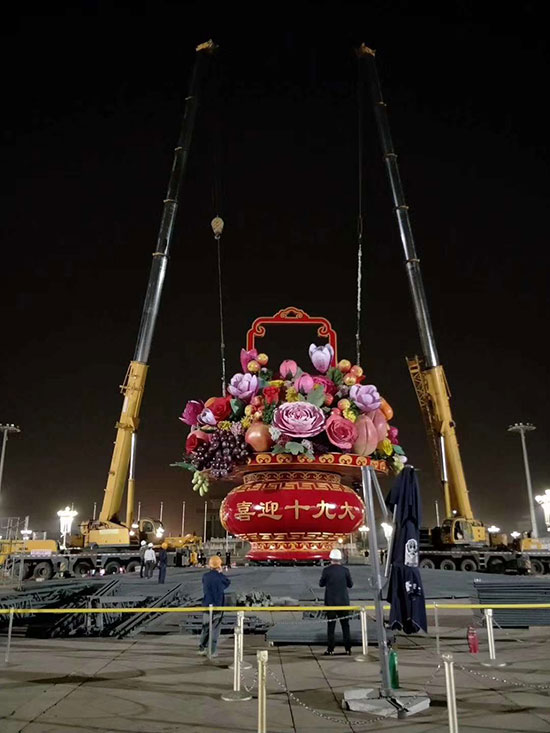 من أجل الاحياء بعيد الوطن، واستقبال الانعقاد المنتصر للمؤتمر الوطني التاسع عشر للحزب الشيوعي الصيني بفرح ومرح، بدأ تزيين ميدان تيان آن من بسلة ضخمة من الزهور الحامل عنوان "تهنئة الوطن الأم" في الرابع والعشرين من سبتمبر، وتحملت رافعة مجموعة XCMG هذه المهمة الشرفة بفضل وظائفها الممتازة. وفي فجر اليوم الرابع والعشرين، دخلت رافعتان لمجموعة XCMG على مستوى 130 طن إلى ميدان تيان آن من، ورفعا طبقات الزهور على السلة الضخمة.