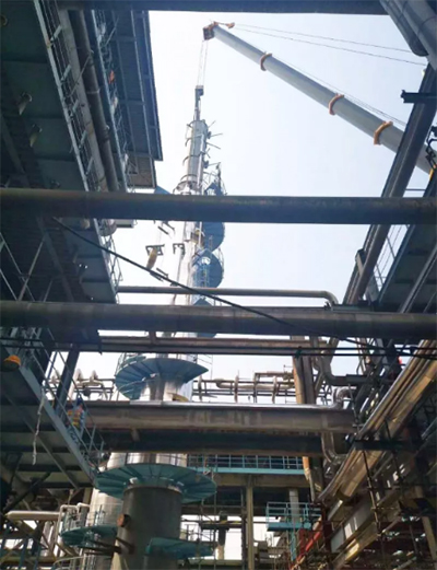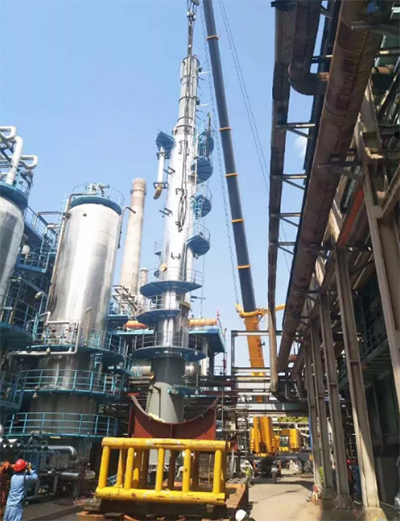 في مشروعات بناء وفحص وصيانة وإصلاح الأجهزة الكيماوية، يتطلب رفع بعض الأجهزة داخل أو خارج الهياكل، وبسبب قيود الهيكل والأجهزة حوله والأنابيب، تزداد صعوبة الرفع. في المشروع الكيماوي في حي جينشان بمدينة شانغهاي، إن حجم طلب إصلاح وصيانة المشروع كبير، والأجهزة ثقيلة، وارتفاعها عال، تتحمل رافعة مجموعة XCMG بطراز QAY650 المسؤولية عن فحص وصيانة الأجهزة في المشروع، ونالت عروضها ثناء من العاملين في موقع المشروع.