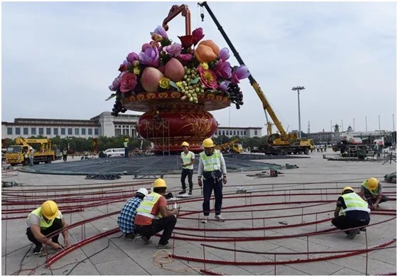 El 14 de septiembre, el Servicio de Bosques y Parques Nacionales publicó el plan de implementación de las flores en la Plaza Tian Anmen y a lo largo de la calle Chang´an. Aquella misma noche, las grúas de XCMG llegaron al centro de la Plaza e iniciaron la instalación nocturna de la estructura de acero. El 19 de septiembre, se inició la inslatación del cuerpo principal del cesto, las dos grúas pusieron el cesto foral sobre su base.
