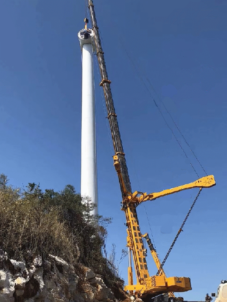 Según el responsable del Proyecto, la grúa XCA5000 se encargó de todas las torres que se ubicaban en terreno pequeño o pendiente, de las cuales la última era la más difícil. Bajo un viento enorme los operadores, con la ayuda del personal de servicio de XCMG, montaron el puntal y las patas para poner el equipo en función.