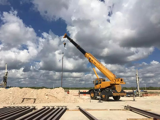 Grúa sobre terrenos difíciles XCMG RT55U en una obra de planta productora de cerveza en Modelo
