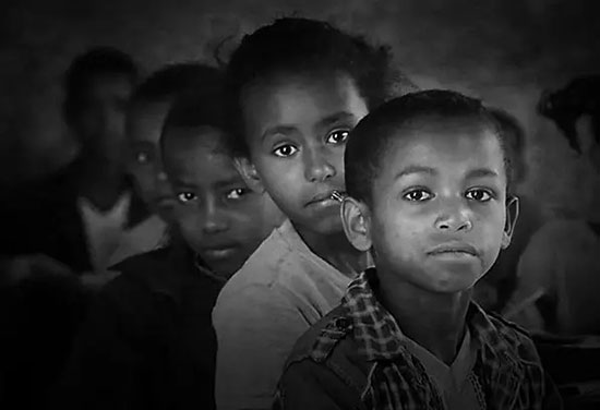 La luz de sol, los ríos, camellos, alumnos después de escuela, estos podrían haber formado una imagen particularmente cariñosa, pero en Etiopía, cuando la temperatura está cada vez más alta, el río se vuelve turbio insoportable y los camellos beben agua en el pesebre juntos con los alumnos, este momento de repente nos pone tristes...