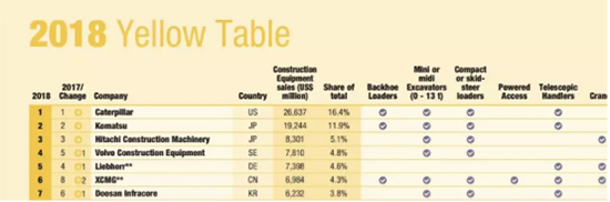 Recientemente, British KHL Group, el proveedor de información más acreditado del mundo sobre maquinaria de construcción, publicó la lista de los 50 fabricantes más importantes de maquinaria de construcción del mundo del año 2018 (Yellow Table 2018), XCMG ocupó el sexto lugar, dos más que el año anterior. En este punto, XCMG sigue manteniendo el primer lugar en la industria de maquinaria de construcción de China durante 29 años consecutivos.
