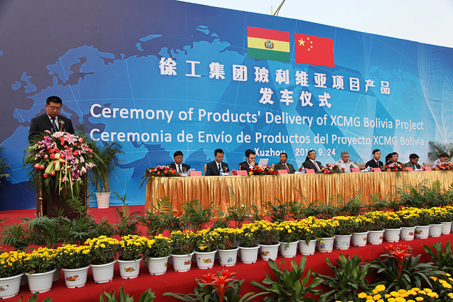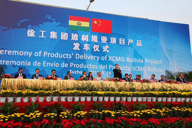 Em 2008, o Corpo de Engenheiros do comandante da Bolívia com o seu grupo passou a visitar XCMG, inspecionou as linhas de produção de guindastes, caminhões bomba, escavadeiras e centro de peças de reposição, e elogiou o nível de processo e fabricação de XCMG . A visita militar da Bolívia simbolizou que o projecto XCMG - Bolívia foi lançado oficialmente. Este projeto levou três anos de acompanhamento e difíceis negociações, até finalmente foi lançado.