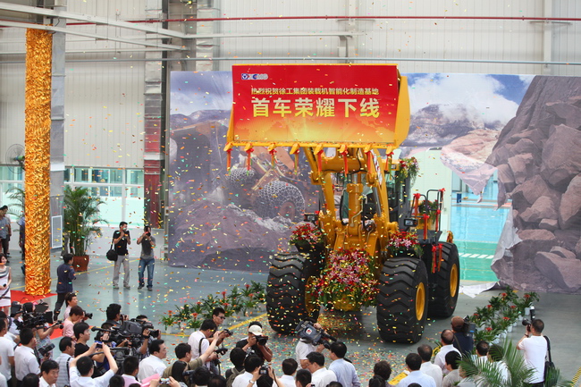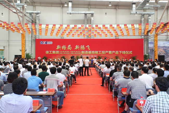 Às 9h e 10 min da manhã, na base de fabricação de transportadoras inteligentes da XCMG, que fica na área de desenvolvimento econômico e tecnológico de Xuzhou, os convidados encheram o local, onde se podia constatar a agitação causada pelo acontecimento. O imenso salão da fábrica e a brilhante vidraça contrastavam com o céu azul, as flores frescas e os equipamentos “dourados” da XCMG, ordenadamente alinhados. Tendo como tema os dizeres “Nova conjuntura – Novo voo”, a “Cerimônia de término das obras da bases de fabricação de guindastes de superfície completa, carregadoras inteligentes, equipamentos de bombeamento de concreto e equipamentos de mistrura de concreto da XCMG e de início da produção e saida dos primeiros produtos da linha de produção” foi realizada solenemente.