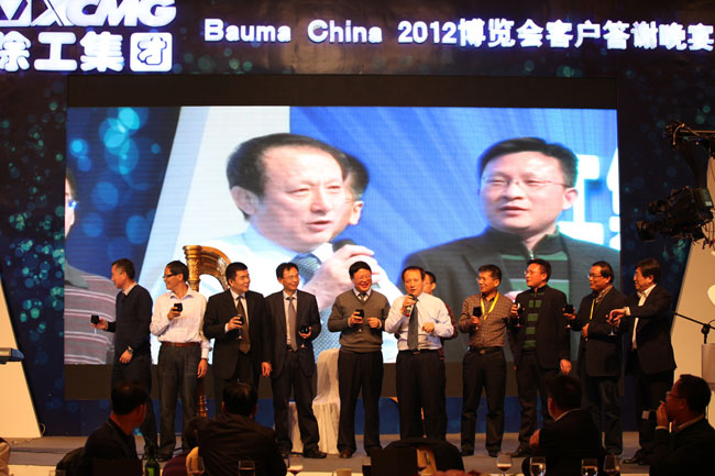 27 de novembro, sob as luzes noturnas do magnífico cenário de Shanghai. O salão de eventos do Hotel Jiali, em Jiangpan,Huangpu encontrava-se cheio, num clima de completa alegria. O banquete de agradecimento aos clientes implementado pela XCMG durante a Bauma Expo começava solenemente. Mais de mil clientes da XCMG, revendedores e amigos da mídia se reuniram no local, conversando acerca da Bauma Expo, trocando informações e fazendo amizades, além de comemorar o imenso sucesso obtido pela exposição da XCMG. Wang Min, Presidente do Conselho da XCMG participou do evento, proferindo discurso.