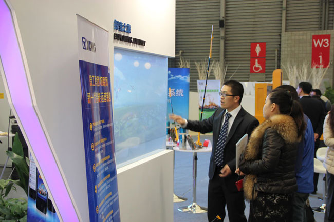 O stand de exposição da internet de coisas da XCMG espalhava-se pelo pavilhão W3, de modo que o stand tinha por tons principais o branco e o azul, com belo e elegante design, além de uma excelente sensação de ambiente tecnológico. O cenário de interação em três dimensões da “jornada da aventura” empregava alta tecnologia de pontos de contato múltiplos e tecnologia de imagem holográfica de projeção traseira, mostrando o processo de funcionamento da internet de coisas da XCMG em todas as gamas num vidro transparente, traduzindo o abstrato conceito de internet de coisas da maquinaria de construção num rolo de pintura sob um céu azulado, dotado de inovação, grande senso de experimentação de tecnologia, grande presença e um efeito impressionante. Durante a exposição, muitos clientes se aproximavam para participar da interação, de modo que todos elogiavam o modo de exibição único da internet de coisas da XCMG, bem como a sua grande capacidade.