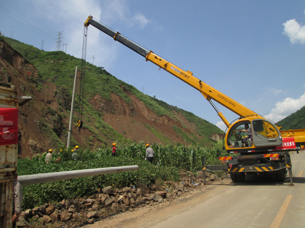 Na manhã de 7 de agosto, com a conclusão de dois dias de reparos e controle de tráfego, a estrada que liga a cidade de Ludian e o município de Longtoushan está basicamente reaberta, o que levou a tropa de transporte das forças armadas a permitir a passagem do caminhão guindaste de pequeno porte. O Comando pediu à China Southern Power Grid Company Limited para concluir rapidamente a instalação de postes e equipamentos de transformador em alguns pontos no município de Longtoushan. Tendo em conta as condições desfavoráveis da estrada, essa empresa estatal decidiu requisitar um dos caminhões guindastes QY12B.5 da XCMG que estavam à espera fora da linha de limite do controle de tráfego, assim, um guindaste de 12 toneladas da XCMG foi colocado no local de reparo imediatamente.