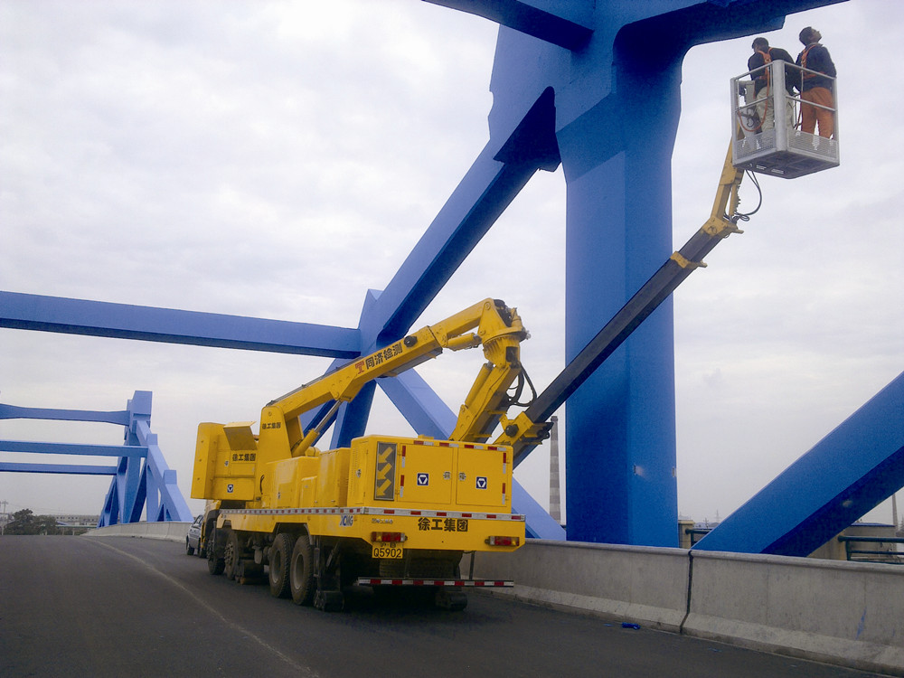Um veículo de detecção de ponte XCMG está realizando as operações de reparação de doença, inspeção e manutenção preventiva de ponte em um viaduto do território de Shanghai, devido à vasta superfície de detecção deste equipamento, pode rapidamente chegar a quaisquer lugares admissíveis em cima e em baixo da ponte, até mesmo enfrenta a forma estrutural complexa desta ponte, pode também ser telecópico flexivelmente, e usado facilmente, não deixa quaisquer impasses para a detecção, juntamente com operação simples, melhorando significativamente a eficiência de trabalho, é louvado pelos operadores no local.