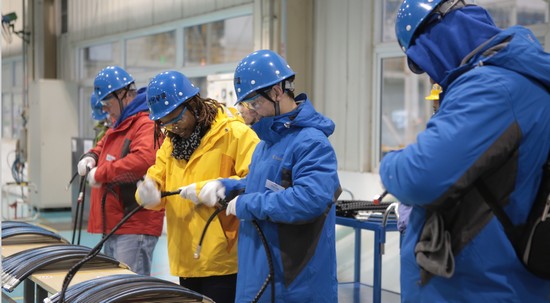 Pela tarde, os "estagiários da XCMG" entraram na base de fabricação inteligente de pás carregadeiras de grande porte da XCMG que ocupa uma área de 230 mil metros quadrados. Ao entrar na base, a saudação em inglês exibida numa grande tela, e um grupo de funcionários de boas-vindas liderado pelas personagens de desenho animado "Xinxin (felicidade)" e "Rongrong (prosperidade)", deixando os "estagiários da XCMG" se sentir muito calor e carinho neste inverno frio.
