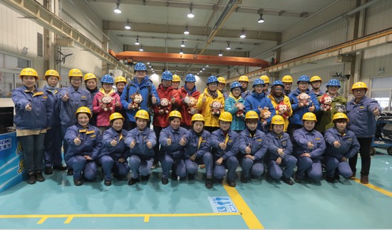 Foto família dos "estagiários da XCMG" e as mulheres trabalhadoras tituladas de "Posto Civilizado de Heroínas" da província de Jiangsu na seção de trabalho de mangueira de borracha