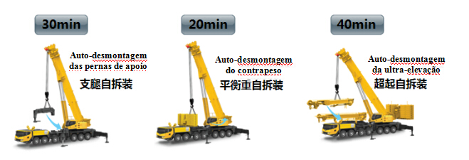 A auto-desmontagem completa, mesmo salvo a utilização de equipamentos auxiliares, será capaz de realizar a auto-desmontagem de alta eficiência. Isto é uma questão importante que estamos a focar em estudar. Atualmente, o XCA450 da XCMG já realiza a função de auto-desmontagem completa. Através da auto-desmontagem completa das pernas de apoio, da auto-desmontagem completa do contrapeso, da auto-desmontagem completa de ultra-elevação e outras tecnologias, em permissa de assegurar a alta eficiência da montagem, poupa custos dos equipamentos de elevação auxiliares para os clientes.