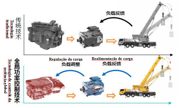 A tecnologia de controle da potência global estabelece o sistema de ligação de motor - mecanismo do trabalho de guindaste, de acordo com o estado de trabalho do guindaste controlam-se automaticamente o volume de emissões do motor de bomba e a velocidade de rotação do mecanismo, para garantir que o mecanismo funciona na melhor área de consumo de combustível, resultando na redução de 10-15% do consumo de combustível, para os clientes, são poupados os custos de combustível.