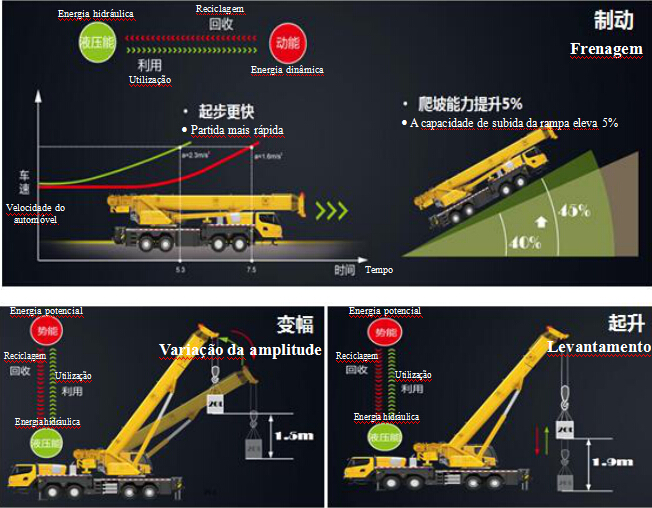 A combustão de gasolina abastece energia ao guindaste, durante o período é possível produzir a perda desnecessária. A tecnologia de reciclagem e reutilização energética poderá efetivamente recolher, armazenar a energia potencial de frenagem, elevação, variação da amplitude do guindaste, a qual é liberada na próxima vez de trabalho, fazendo com que a partida, a subida de rampa, a variação da amplitude, o levantamento estejam mais eficientes.