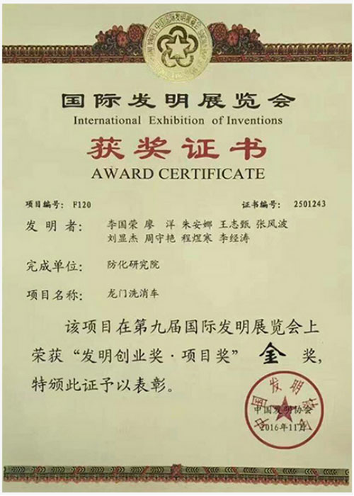 Em 17 de novembro de 2016, realizou a 9ª Exibição Internacional de Invenção no Centro Internacional de Convenções e Exposições de Kunshan, o projeto de XCMGSC em cooperação com Departamento de Armamento do Exército - Veículo de Lavagem e Desinfeção de Pórtico obteve "o Prémio de Ouro de Prémio Internacional de Criação e Invenção."