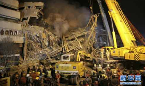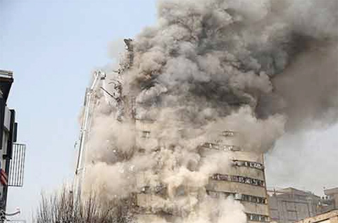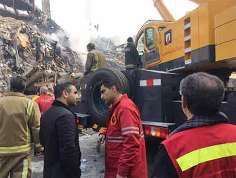 Irã ,no local da manhã seguinte de 19 de Janeiro, o edifício pulasike no centro de Teerã, Irã (Plasco) entrou em colapso após o incêndio, o acidente matou pelo menos 30 bombeiros que no caso foram mortas e causou mais de 70 feridos.