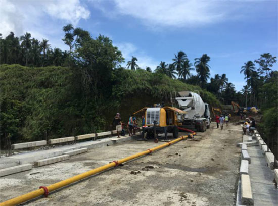 A Região de Caraga fica no sul de Filipinas, o caminhão de bomba de concreto de e caminhão misturador de concreto de XCMG dedicam-se à construção da ponte rodoviária.