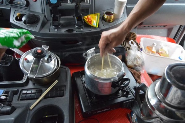 Nas montanhas de Ruili, não tinha restaurante nos arredores, então o motorista Wei que estava esperando pelas bananas teve que cozinhar para si mesmo. O espaço na sala de armazenamento da cabina Hanfeng é muito rico. Além das necessidades diárias, como roupas e produtos de higiene, pequenos utensílios de cozinha podem ser colocados. Alguns minutos de esforço, um prato quente e delicioso foram prontos.