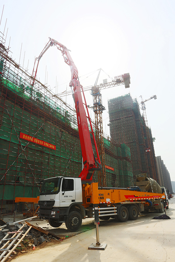 Currently the new generation “K” series products of XCMG—the 50-m three-bridge pump truck with globally longest full steel arm performs perfectly in the construction. The product successfully challenged the limits of 3-bridge base with the globally longest full steel arm and led the new height in technology among rival products. The reporter saw at the site that the construction site was extremely narrow and rugged. With a longitudinal angle between the rear landing leg and the machine body below 30°, the said product can work for ten hours in succession at a pouring speed of 60-70 cubic meters per hour, successfully finishing its debut with a perfect construction effect.