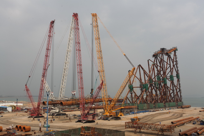 On May 15, XCMG’s thousand-ton level crawler crane again challenged the limit of hoisting in ocean engineering by competing with three other peers of DEMAG at Penglai of Shandong Province. The Chinese corporation has successfully finished the heavy-load walking, moving 800-ton structure part for about 60 meters onto the jacket more than 200 meters away, accomplishing one of the most difficult tasks in hoisting history. Mr. Yu Limin, board chairman of GST Group commended: This was an extremely hard hoisting work. Before that, we have tried all means, including gantry crane, pan car amid others, leading to failure eventually. And we eventually chose the plan of Four-crane Hoisting.