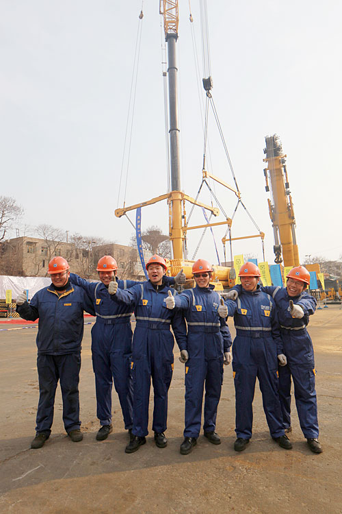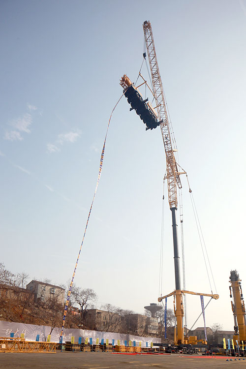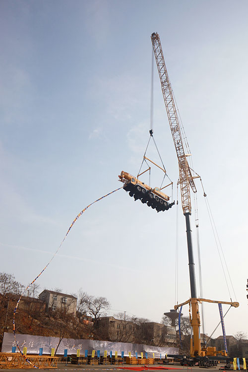 At noon of Jan 12th 2012 the challenge was formally staged. As the lifting altitude increased, nervous expression was gradually found on the faces until the measuring scale hanging down from QY160K registered 80 meters.