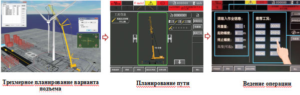 Корпорация XCMG установила систему планирования варианта подъема в систему подъема груза, в системе подъема осуществляется упрощенное моделирование, после выполнения моделирования автоматически создается путь следования операции, который показывает оператору каким образом данная операция должна выполняться. Согласно данной идеи, возможно в будущем подобные операции смогут осуществляться без помощи человека, с использованием автоматической системы управления, сочетающей в себе технологию дистанционного управления подъемным краном и систему ведения.