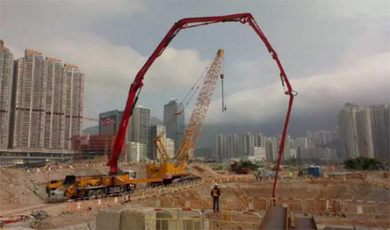 Автобетононасос XCMG HB52A и гусеничный кран принимают участие в проекте строительстве подземного метро, прежний адрес аэропорта ''Кай Так'' в Гонконге