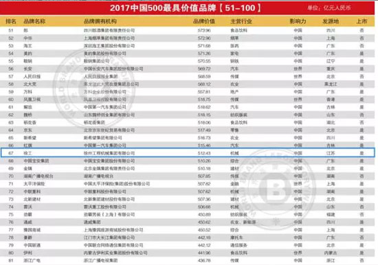 22 июня 2017 г., 14-ый саммит мировых брендов и 14-ый брифинг 500 самых ценных брендов Китая состоялись в Пекине. Лаборатория мировых брендов (World Brand Lab) опубликовала рейтинг "500 самых ценных брендов Китая - 2017", XCMG с показателем в 51,243 млрд. юаней занял 67-е место, в очередной раз, возглавил список предприятий-производителей строительного оборудования Китая. По сравнению с 2016 годом (43,018 млрд. юаней) рост составил 8,162 млрд. юаней, масштаб роста 18,9 %. С того времени, как XCMG попал в список, компания в течение четырех лет возглавляет отрасль.