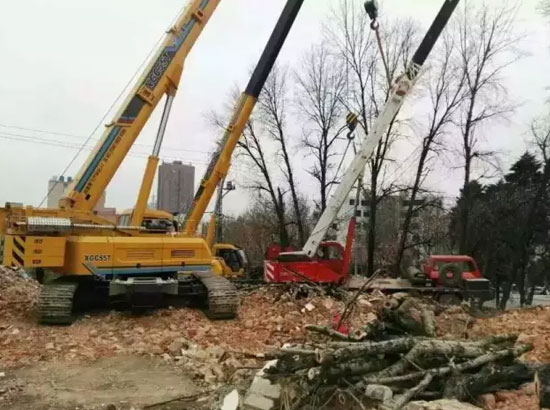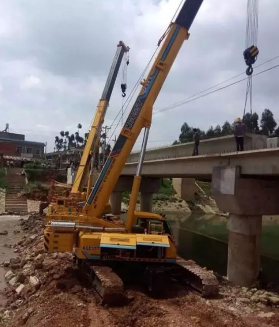 На одной рабочей площади в Наньнине, кран грузоподъемностью 25 т. из-за окружающих сложных условий строительства на месте и слабой установки опор возник опрокидывание на борт. Как раз два гусеничные крана XGC55T рядом работают, посредством растяжения основных стрел, взвешивания крюка, взаимного действия двух кранов данный кран в аварии успешно выпрямлен, после того, немедленно поступил к работе. Потом ответственное лицо рабочей площади сказал, “Слава богу, есть гусеничные краны XCMG, иначе нерадостные условия работы действительно тратит время спасания и увеличивает себестоимость спасания”.
