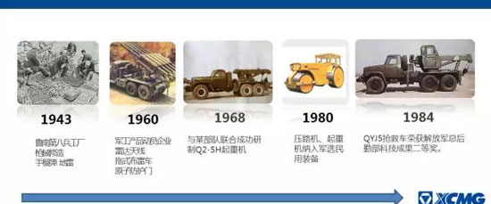 Превратить нашу военную технику изготовления в историческую картину, XCMG всегда была с Китаем на одном дыхании, связана общей судьбой. С создания боеприпасов, ремонта оружия, ручных гранат, мин, производственных заданий для радаров доходит до 60-х годов, минный автопоезд-раскладчик, противоатомная защитная дверь и другие производственные задачи, в 1968 году успешно создан 5-тонный военный кран, в 1980 году дорожный каток, кран вошли в военные гражданские оборудования, в 1984 год 5 тонный корабль-спаситель был награжден наградой второго уровня за научно-технические достижения Управлением тыла.