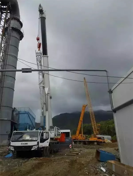 Монтаж производственной линии в Индонезии по восстановлению никеля, работающая техника включает в себя стотонный автокран и гусеничный кран, а также множество другой продукции XCMG, совместно выполняющей подъемно-погрузочные работы.