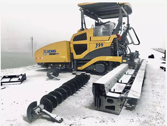 Сотрудники XCMG собирают асфальтоукладчик RP1655 под снегом.