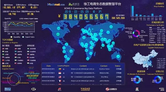 Во время посещения одного из офисных зданий компании электронной коммерции XCMG в Парке программного обеспечения г.Сюйчжоу, внимание журналистов привлек большой электронный экран. На экране отображена интеллектуальная платформа под названием «Экологические данные интернет-коммерции XCMG», она ведет реестр данных транзакций платформы на внутреннем и внешнем рынках в режиме реального времени, характеристики бизнес-возможностей, а также расположение клиентов и другой контент.
